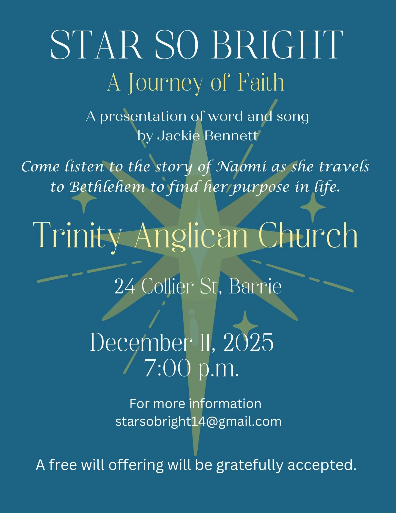 7. Mark Your Calendar! Trinity is hosting a presentation of Star So Bright: A Journey of Faith, written by Jackie Bennett, on Thursday, December 11, 7:00 p.m. The story, which consists of readings and ten original pieces of music, is about a fictitious woman who is called by God to go to Bethlehem during a time when women did not travel on their own. With great courage and faith, she does as she is asked, and discovers, not only a miracle, but her purpose in life. Although this fictitious story is set in biblical times, it tells of a journey that is relevant today as we all search for where we belong and how our faith leads us there. The music, written with eastern, pop and folk influences, will be performed by the Star So Bright band, and the story will be told by women from our congregation. A free will offering will be collected with proceeds being shared between our church and the band. (If there is a particular place where this money will be shared it can be mentioned here.)